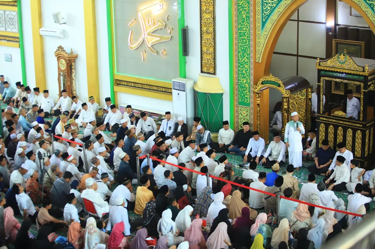 MusiNews.id, PALEMBANG – Gema solawat dan lantunan ayat suci Al-Qur’an memenuhi ruang utama hingga selasar Masjid Raya Taqwa, Palembang, pada Minggu (5/4/2026). Ribuan masyarakat dari berbagai lapisan tampak memadati masjid bersejarah tersebut untuk menghadiri peringatan 40 hari wafatnya tokoh besar Sumatera Selatan, Almarhum H. Alex Noerdin bin H. M. Noerdin Pandji.